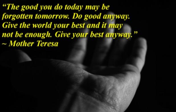 “The good you do today may be forgotten tomorrow. Do good anyway. Give the world your best and it may not be enough. Give your best anyway.” ~ Mother Teresa